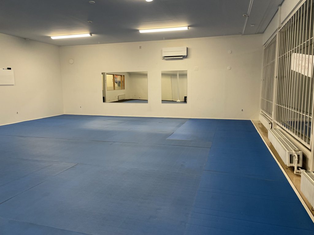 Tilassa pehmeä jumppalattia. Huomioithan, että tilassa ei voi treenata/kävellä ulkokengillä!